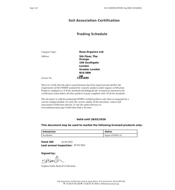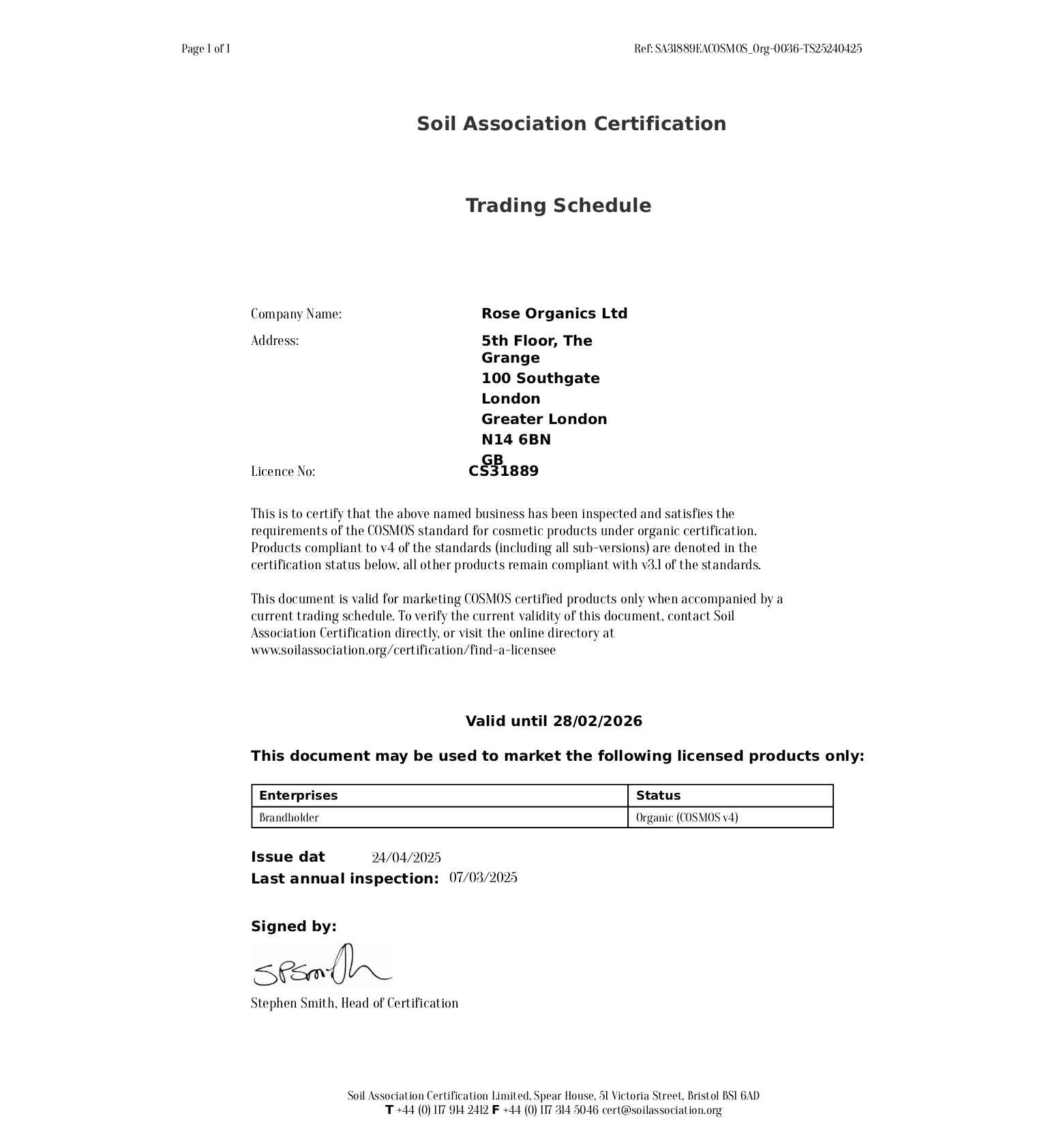 At Rose Organics, we craft high-quality, COSMOS-certified skincare products made in the UK, using only certified organic ingredients, not just those that are approved. We work in partnership with trusted UK expert manufacturers to develop gentle yet effective formulations suitable for all skin types, with a special focus on the needs of mature skin.